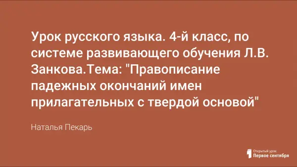 Представлен конспект урока русского языка в 4-м класс по системе развивающего обучения Л.В. Занкова, по теме "Правописание падежных окончаний имен прилагательных с твердой основой".