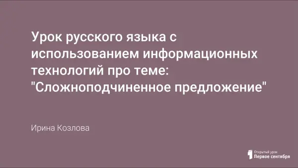 Сегодня, с приходом в школу информационных компьютерных технологий (ИКТ), появилась возможность интенсифицировать преподавание русского языка, повысить темп современного урока, увеличить объём коммуникативных упражнений за счёт сокращения затрат времени на некоторые виды работ и, конечно, дифференцировать обучение. Представленный урок по русскому языку с использованием ИКТ "Сложноподчинённое предложение" предназначен для учащихся 9-го класса. Это первый урок в системе уроков по СПП. Он предполагает актуализию ранее изученного, многоаспектное повторение, аналитическую работу с текстом. Урок рассчитан как на целый класс, так и на группу учащихся.