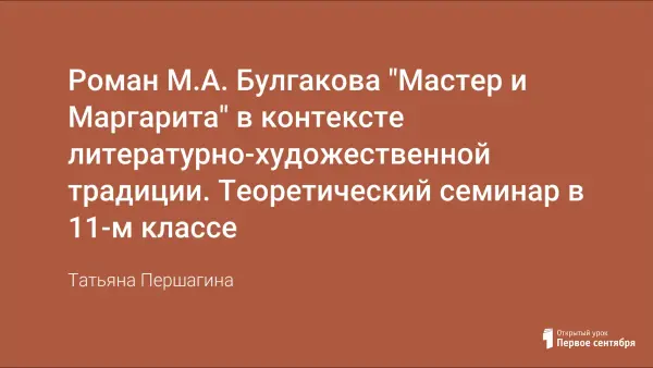 Как известно, "закатный" роман М.А. Булгакова необычайно богат аллюзиями и реминисценциями из самых различных произведений, что определяет глубокую полемичность романа и высочайший уровень духовности, присущий бессмертной книге Булгакова. Это и определило основной аспект изучения романа "Мастер и Маргарита" в 11-м классе.