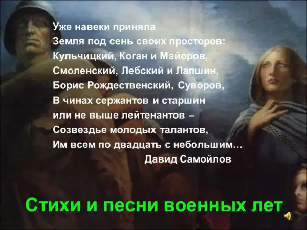 Материал представляет собой сценарий литературно-музыкальной композиции для проведения урока по теме «Литература военных лет и литература о Великой Отечественной войне». К сценарию прилагаются: презентация о поэтах-фронтовиках и музыкальные фрагменты для сопровождения.
