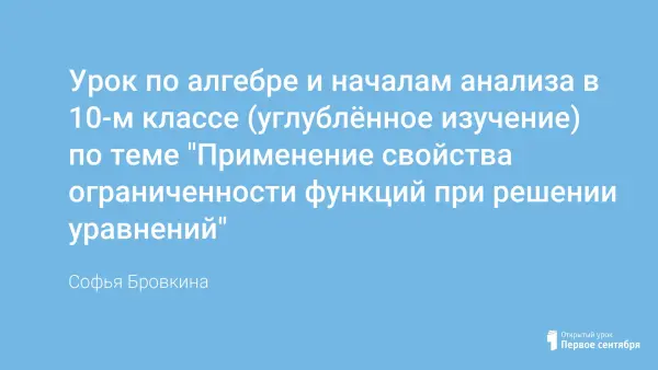 Данный урок является одним из системы уроков, посвященных использованию свойств ограниченности и монотонности функций при решении уравнений на уроках алгебры в 10—11-х классах. Цель урока: познакомить учащихся с нестандартными методами решения уравнений, основанными на применении свойств ограниченности функций.