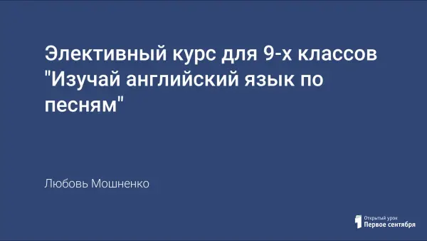 Цель элективного курса - пробудить интерес к выбору филологического профиля в старшей школе. Взяв за основу песенный материал, учитель имеет возможность расширить языковую, коммуникативную, лингвострановедческую компетенции учащихся и привлечь детей в профильный класс.