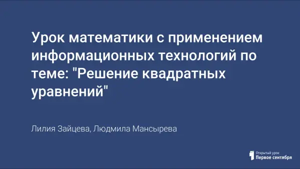 Нами разработана серия из шести уроков по теме «Решение квадратных уравнений с применением информационных технологий". Урок первый. Объяснение новой темы. Мультимедийная презентация.