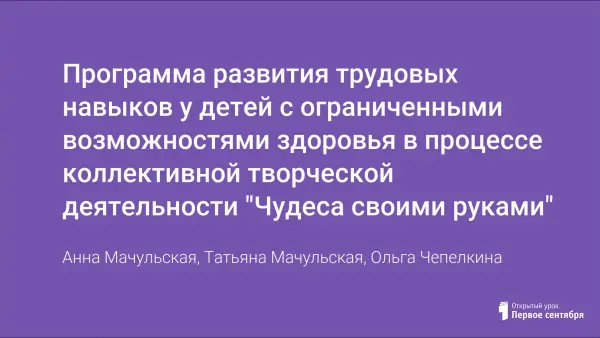 Представлена программа развития трудовых навыков у детей с ограниченными возможностями здоровья в процессе коллективной творческой деятельности «Чудеса своими руками» для учащихся среднего и старшего школьного возраста. Программа предполагает учет индивидуальных и психологических особенностей каждого ребенка с ограниченными возможностями здоровья.