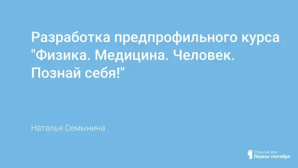 Необходимым условием создания образовательного пространства, способствующего самоопределению учащегося, является введение предпрофильной подготовки через организацию курсов по выбору. Предпрофильный курс "Физика. Медицина. Человек. Познай себя!" позволяет взглянуть на процессы, протекающие в организме человека, с точки зрения физики. Основополагающий вопрос курса: "Физика - это наука о природе. Может ли физика помочь мне познать себя?" Такая необычная постановка вопроса стимулирует познавательную активность ребят, позволяет взглянуть на окружающий мир с позиций синергетики.