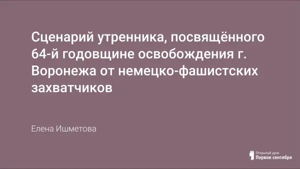 В историю войны вошло множество городов, показавших массовый героизм его защитников, среди них город Воронеж. Торжественный утренник, посвященный дню освобождения Воронежа от немецко-фашистских захватчиков, позволяет познакомить учащихся с историей Воронежского сражения. Подвести к пониманию того, что Воронежская область внесла заметный вклад в победу над врагом. Показать героизм советских людей, солдат, проявленный в сражении за Воронеж. Воспитывать у учащихся интерес к истории своего края, любовь к Отечеству.
