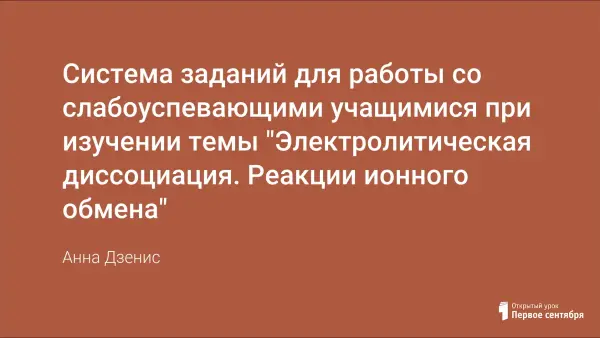В работе предлагается система заданий для формирования у слабоуспевающих и много пропускающих по болезни учащихся необходимых умений при изучении темы «Электролитическая диссоциация. Реакции ионного обмена».