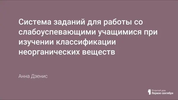 В данной работе предлагается система заданий для формирования у слабоуспевающих и много пропускающих по болезни восьмиклассников умений называть вещества по их химическим формулам, определять принадлежность веществ к определенному классу, составлять формулы веществ различных классов неорганических соединений.