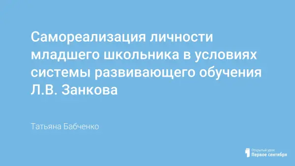 Представленная работа является квалификационной работой учителя начальных классов по обобщению опыта. В ней рассматривается создание условий для самореализации личности ребенка в осуществлении его позитивных возможностей через раскрытие задатков и способностей, через принципы развивающего обучения Л.В. Занкова, так как именно развивающее обучение помогает развитию и самореализации личности.