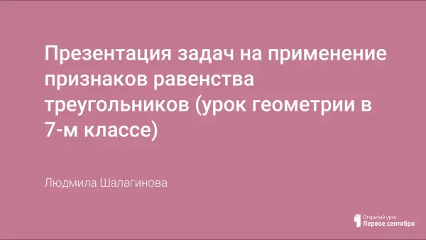 Урок-презентация задач на применение признаков равенства треугольников изучается во второй главе "Треугольники" курса геометрии 7-го класса. Признаки равенства треугольников открывают широкие возможности для решения задач, позволяют накапливать опыт доказательных рассуждений. Урок проводится по схеме: представления задач учащимися, их обсуждение и решение. Это нацеливает учащихся на самостоятельное выполнение рисунков по условию задачи, позволяет формировать у учащихся умение доказывать равенство треугольников, то есть выделять равенство трех соответствующих элементов данных треугольников, и делать ссылки на изученные признаки.