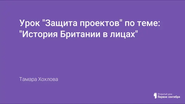 Урок "История Британии в лицах" – это урок защиты проектов в рамках темы "Как управляется Британия" по учебнику В.Н. Богородицкой, Л.В. Хрусталевой для учащихся 10—11-х классов школ с углубленным изучением английского языка. Проекты – результат самостоятельной работы учащихся с дополнительным материалом по теме. Представлены три проекта: с использованием компьютерных слайдов ("Жертвы истории" – два ученика); проект — ролевая игра (телешоу "История в лицах. Кровавая Мэри" – два ученика) и защита реферата-исследования ("Век Елизаветы и век Шекспира" – один человек), сопровождающийся рецензией на реферат и дальнейшим обсуждением реферата учащимися.