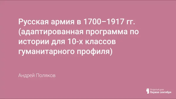 Данный спецкурс охватывает очень обширный период отечественной истории - с 1700 по 1917 год, от петровских реформ и становления Российской империи до ее краха в 1917 году. В рамках спецкурса предполагается рассмотреть лишь одну из сторон данного исторического этапа - становление, развитие и крах российской армии, ее славные победы и трагические поражения.