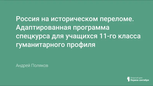 Данный спецкурс охватывает переломный этап в отечественной истории - с 1894 по 1920 годы. Данный период включает в себя целый ряд важнейших исторических событий - возникновение революционной ситуации в начале XX века, революцию 1905–1907 гг., период "успокоения и реформ" 1907–1914 гг., участие России в первой мировой войне, революционный 1917 год, первые мероприятия большевистской власти и гражданскую войну 1918–1920 гг.