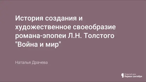 Роман "Война и мир" Л.Н. Толстого является одним из самых сложных произведений, представленных в курсе литературы в 10-м классе. Поэтому очень важно на первом этапе работы с произведением дать представление об истории создания, особенностях жанра, проблематике, разобрать смысл названия романа-эпопеи. Этому посвящён данный урок.