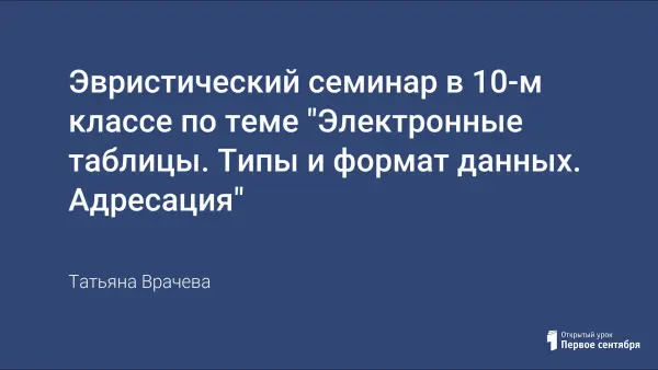 Вводный двухчасовой эвристический семинар является первым занятием в изучении темы "Технология обработки числовых данных" по программе профильного курса "Информатика и ИКТ" на базовом уровне Н.Д. Угриновича. Семинар проводят два "сильных" ученика, которые выполняют поочередно роли учителя, консультанта и групповода. Эвристический семинар - это форма занятий, которая обеспечивает создание учащимися личных образовательных продуктов.