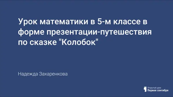 Меня давно волнует проблема адаптации детей при переходе из начального звена в старшее. Чтобы психологический барьер 5-го класса был для обучающихся менее ощутим, я практикую на своих уроках математики использование игр, сказок. Об одном из таких уроков рассказывается в этой работе. Форма урока - презентация-путешествие по мотивам русской народной сказки "Колобок".