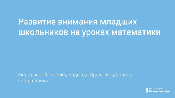 Урок математики, направленный на развитие внимания. Только научив детей быть внимательными, учитель может рассчитывать на успех учебной и воспитательной работы. Произвольное внимание у школьников 6–7-ми лет недостаточно развито. Поэтому в статье представлены задания, способствующие развитию произвольного внимания.