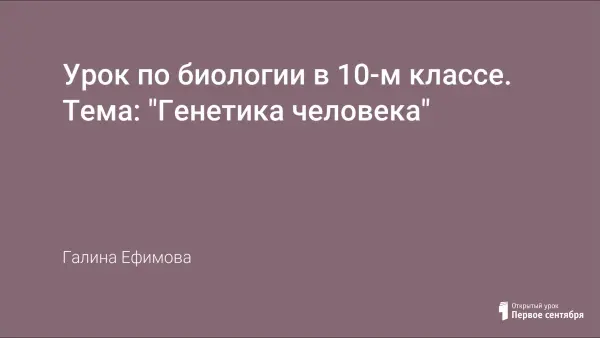 Урок по теме "Генетика человека" рассчитан на два академических часа. Отличается четкой организационно-методической структурой. Метод - лекция, сообщения учащихся. Содержательная сторона вопросов урока не только в материале, отобранном учителем для рассказа, но и в выступлениях учащихся, в наглядности, в содержании самодельных и сравнительных таблиц на рабочих местах учащихся. Использованы возможности здоровьесберегающих и компьютерных технологий.