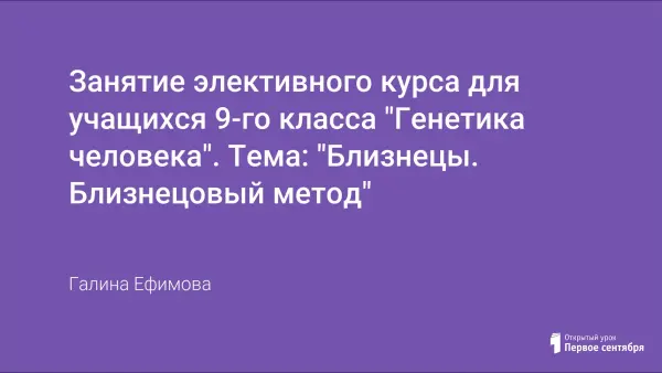 Одной из тайн природы являются близнецы. Данной теме посвящено занятие элективного курса с учащимися 9-го класса. Научные, статистические данные, наглядность содержатся в презентации «Близнецы. Близнецовый метод», которая сопровождает данное занятие.