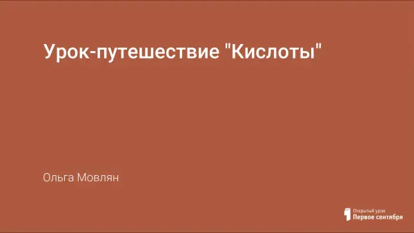 Урок формирует у учащихся представление о кислотах (составе, классификации, представителях). В ходе урока учитель опирается на работу по развитию умения составления формул химических соединений. Также во время урока учащиеся совершенствуют знания химического языка (называние кислот).