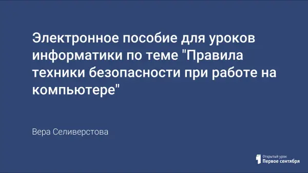 Электронное пособие выполнено в форме презентации в PowerPoint. Это стандартная инструкция по правилам техники безопасности при работе на компьютере, переработанная более доступным для учащихся языком (особенно для учащихся младших классов, когда изучение информатики начинается со 2-го класса), для более понятного восприятия и запоминания. Для закрепления материала прилагается компьютерный тест.