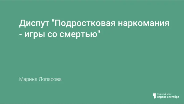Внеклассное мероприятие по биологии, посвященное профилактике наркомании. Проводится в виде диспута "Подростковая наркомания - игры со смертью". Главные участники - учащиеся 9—11-х классов. В беседе принимают участие родители, группа экспертов, инспектор по делам несовершеннолетних, медработник, глава сельской администрации. Используется музыкальное сопровождение и отрывки из кинофильмов. Ребятам предлагается сделать свой выбор.