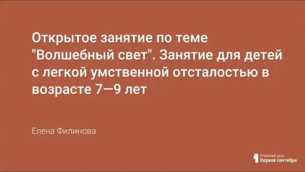 Открытое занятие проводится для детей с легкой и умеренной степенью умственной отсталости. Возраст детей 7–9 лет, в количестве 4 – 6 человек. Длительность занятия 30–35 минут. Цель: с помощью оптических эффектов сенсорной комнаты переключать внимание обучающихся, уводя их от фрустрирующих тем, создать соответствующий настрой релаксации.