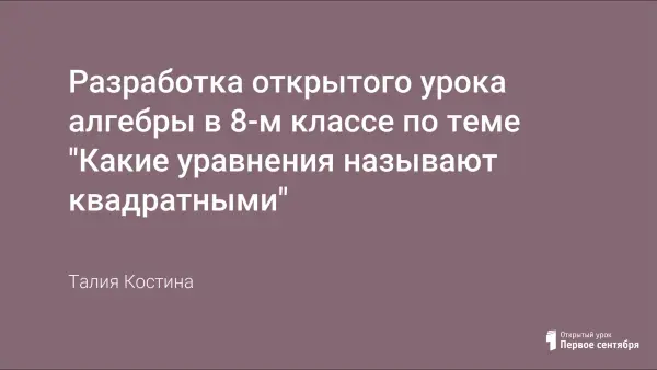 В разработке представлен конспект урока «открытия нового знания». Использованы элементы развивающей системы, происходит обучение приемам самостоятельной работы, умениям добывать знания, обобщать и делать выводы, на уроке применяются информационные технологии. Презентация «Из истории квадратных уравнений».
