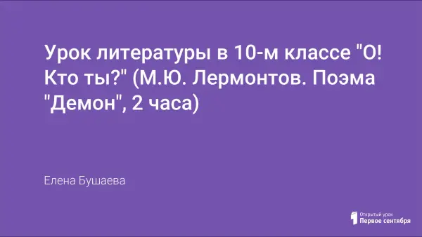 Урок литературы в 10-м классе – один из возможных вариантов изучения поэмы М.Ю. Лермонтова «Демон», вошедшей в стандарт по литературе для старшей школы на профильном уровне. Двухчасовое занятие с домашним творческим заданием расширяет знания о творчестве М.Ю. Лермонтова, а также помогает понять образ Демона в творчестве поэта, в искусстве (при изучении поэмы используются иллюстрации картин М.А. Врубеля, аудиозапись оперы Р.Вагнера).