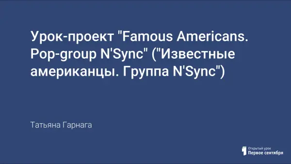 Урок-проект "Famous Americans. Pop-group N'Sync" является завершающим в серии уроков об известных людях Америки. Из учебника учащиеся узнали о писателях, изобретателях, художниках и артистах. Группа N'Sync - это их выбор. Ребята готовили этот урок сами от начала до конца. С моей стороны это были советы и контроль определенных этапов работы. Урок построен в форме телевизионной музыкальной программы. Одна ученица - ведущая программы. Остальные - зрители в зале. Всем зрителям даны определенные задания.