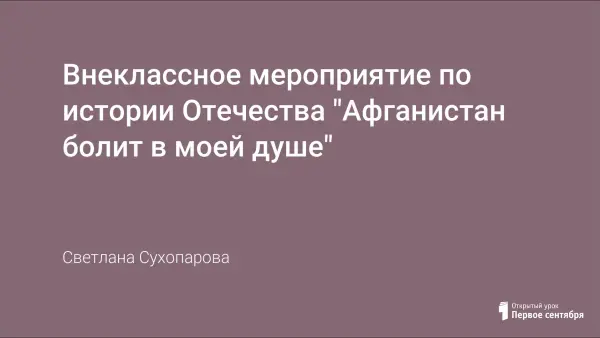 Данное мероприятие проводится для учащихся 9-11-х классов. Основные цели: познакомить учащихся с основными причинами, ходом событий и итогами афганской войны, развивать внимание, память, логическое мышление, умение слушать, анализировать и делать выводы, воспитывать патриотические чувства, гордость за своих земляков, провести грань между войной и миром.