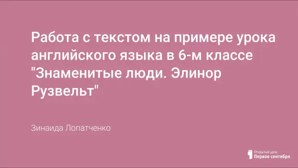 В работе кратко описаны основные виды работы с текстом на уроках английского языка. Предлагается разработка урока в 6-м классе "Знаменитые люди. Элинор Рузвельт" (УМК В.П. Кузовлев). Урок будет интересен учителям, которые только начинают свою педагогическую деятельность.