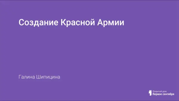 Урок изучает причины создания Красной Армии, обеспечивает повторение изученных понятий Рабоче–Крестьянская Красная Армия (РККА), Реввоенсовет, Совет рабочей и крестьянской обороны.