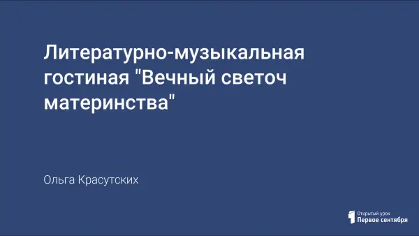 Литературно-музыкальная гостиная посвящена всемирному Дню матери. Хозяева гостиной (4 ведущих, чтецы, певцы- ученики 10-11-х классов) приглашают своих гостей познакомиться с выдающимися произведениями художников, поэтов, композиторов, посвященных образу женщины, матери.