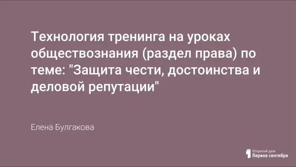Урок обществознания для 11-го класса знакомит учащися с основными категориями нематериальных благ - частью, достоинством, деловой репутацией - испособами и формами их защиты посредством уголового и градиентного права.