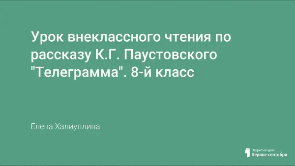 Урок, представленный мною на фестиваль, это урок внеклассного чтения в 8-м классе по рассказу К.Г. Паустовского "Телеграмма". Чтобы достучаться до своих девчонок и мальчишек, использую разнообразные формы: проблемные вопросы, беседу, музыку, выразительное чтение; "приём поднятой ладони", когда ребёнку необходимо быстро выбрать свою позицию, своё отношение к прочитанному.