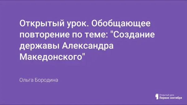 В данной работе представлен конспект обобщающего урока по теме «Создание державы Александра Македонского». Этот урок позволяет систематизировать знания учащихся по истории Древней Греции, закрепляет знания учащихся о причинах гибели Персидского царства и образовании державы А.Македонского. Продолжается формирование умений учащихся работать с исторической картой, делать выводы, обобщать.