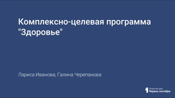Комплексно-целевая программа "Здоровье" направлена на координацию усилий всех участников образовательного процесса на сохранение и укрепление физического и психического здоровья детей дошкольного и младшего школьного возраста в условиях преемственности и непрерывности здравотворческой деятельности. В программе сформулированы цель в виде ожидаемого результата, задачи, план-график работы на один год по направлениям: информационное обеспечение, методическое обеспечение, работа с кадрами, работа с детьми, работа с родителями, финансовое и материально-техническое обеспечение.