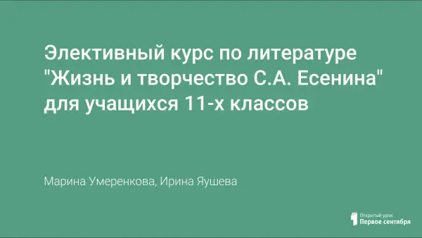 Элективный курс "Жизнь и творчество С.А. Есенина" рассчитан на 12 часов. Цель данного курса - переосмыслить роль поэзии С.Есенина и его личности в русской литературе XX века. Учащиеся вовлекаются в различные виды деятельности, что способствует развитию и совершенствованию навыков самостоятельной работы. Основными видами, формами организации учебной деятельности являются лекции, семинары, практические занятия.