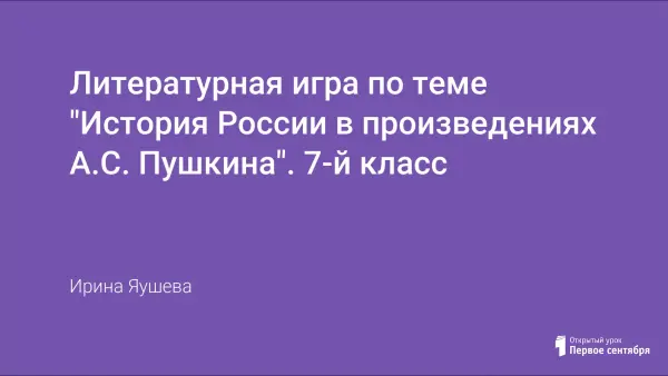 Творчество А.С. Пушкина в программе 7-го класса представлено следующими произведениями: балладой «Песнь о вещем Олеге», поэмой «Медный всадник», трагедией «Борис Годунов» и поэмой «Полтава». Именно на эти произведения ориентирована большая часть заданий. Как показывает практика, тема урока вызывает живой интерес у детей разных возрастов, а игровая форма урока не оставит равнодушным ни одного ученика.