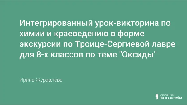 Предложенный интегрированный урок по химии и краеведению проводится в 8-м классе с использованием презентации, выполненной в программе Power Point. В процессе урока учащиеся совершают виртуальную экскурсию вокруг стен Троице-Сергиевой лавры, знакомятся с историей края. По ходу экскурсии учащиеся отвечают на вопросы викторины и посредством химических знаний получают сведения о названии башен, расположенных по лаврской стене. Данный урок позволяет не только закрепить знания и умения учащихся по теме "Оксиды", но и делает этот процесс познавательным и увлекательным.