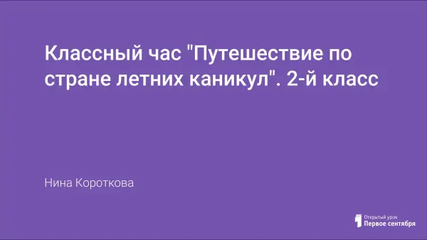 Каждый год, встречаясь с детьми после летнего отдыха, хочется больше узнать о том, как они отдохнули, где побывали, что узнали нового. Можно, конечно, традиционно написать сочинение о летнем отдыхе, но я составила урок, который назвала "Путешествие по стране летних каникул". Этот урок я провожу во втором классе (можно и в третьем). Игровая форма занятия позволяет высказаться каждому ученику, чувствовать себя более раскрепощенным, эмоционально настроиться на начало учебного года и вместе с тем позволяет расширить знание детей об окружающем мире.