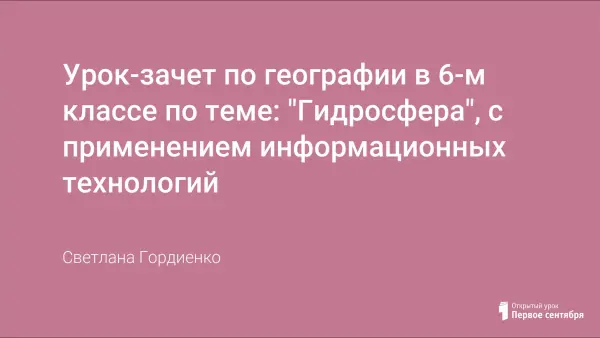 Значительная часть урока (зачёт по теме "Гидросфера") посвящена повторению понятий по теме и закреплению работы с картой. Особое место уделено проверке знаний вод своей местности. Разминка предполагает работу ребёнка в команде, что в первую очередь развивает коммуникативные навыки. Интерес у семиклассников вызовет разгадывание кроссворда на компьютере. Такая организация зачёта позволит объективно и за короткое время оценить знания и умения учащихся по теме "Гидросфера".