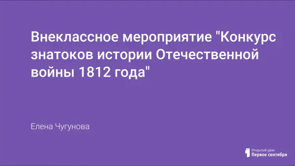 Внеклассное мероприятие по истории для учащихся 7–8-х классов. Цель: закрепление знаний по истории Отечественной войны 1812 года, воспитание чувства гордости и любви к родине на примерах подвигов российского народа; развитие мышления, воображения, умения работать в группах, взаимодействия со сверстниками. Учащиеся командами по 4–6 человек выполняют задания, связанные со знанием литературных произведений, карт, краеведческого материала и т. д.