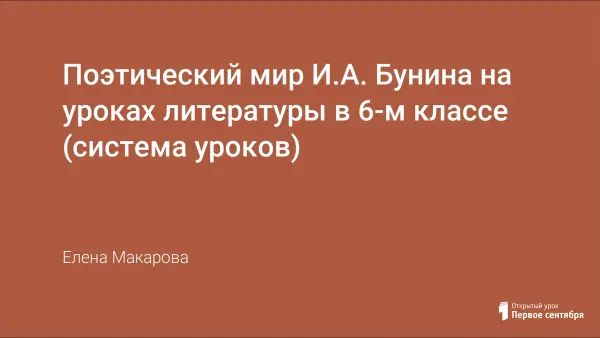 Система уроков по творчеству И.А. Бунина построена таким образом, чтобы знакомство с произведениями поэта стало одновременно этапом в освоении лирики как рода литературы. Основа представленных уроков - работа над подготовкой выразительного исполнения лирического произведения. Важной составляющей уроков является и работа над созданием и анализом лирических высказываний учащихся. Эти виды работы позволяют ученикам на практике осознавать особенности лирики как литературного рода.