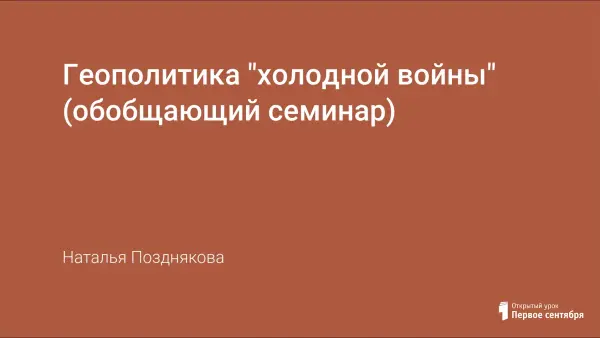 Урок по всеобщей истории для 9-го класса является заключительным в разделе "Международная политика в 50-х - 90-х годах". Форма урока - обобщающий семинар. Целью занятия является анализ международной политики в период "холодной войны". Урок рассчитан на 2 часа. Урок состоит из анализа причин, предпосылок и основных признаков "Холодной войны", заполнения таблицы "Периоды "холодной войны" противостояние и сотрудничество". Урок предполагает подготовку учениками сообщений по теме и слайд-шоу с иллюстрациями и основными схемами по теме.