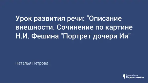 Цель урока - подготовить учащихся к написанию сочинения по картине Н.И. Фешина "Портрет дочери Ии". На уроке активизируется портретная лексика, приводятся описания внешности героев из различных произведений. Ребята выступают с индивидуальными сообщениями о художнике Н.И. Фешине, о его портретах. Учитель даёт задание описать внешность героини, используя имена прилагательные, причастия и причастные обороты. Дома учащиеся пишут сочинение.