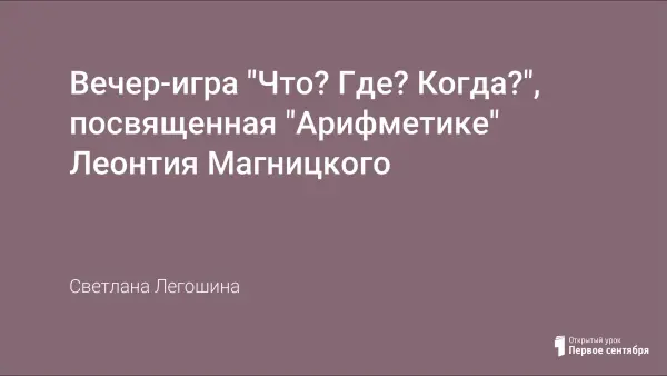 Данное занятие направлено на формирование у школьников мотивации учения, интереса к предмету. В ходе внеклассного мероприятия учащиеся знакомятся с биографией Леонтия Магницкого, русского педагога, автора учебной книги по математике, на которой в течение многих лет воспитывалось не одно поколение россиян. Вопросы для игры составлены из задач "Арифметики" Магницкого, а также связаны с интересными фактами из жизни автора и содержанием его книги.