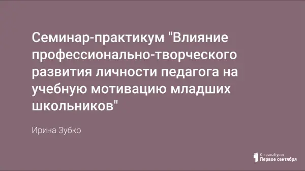 В данной статье представлены материалы семинара - практикума. Изучение мотивации и ее формирование - это две стороны одного и того же процесса воспитания мотивационной сферы целостной личности ученика. Сформированность у ребенка мотивационной сферы играет важнейшую роль в успешности овладения учебной деятельностью. Важнейшую роль в развитии учебной мотивации играет творческий потенциал педагога. Педагогическая деятельность, как и любая другая, имеет не только количественную меру, но и качественные характеристики. Содержание и организацию педагогического труда можно правильно оценить, лишь определив уровень творческого отношения педагога к свое деятельности, который отражает степень реализации им своих возможностей при достижении поставленных целей. Данный семинар - практикум может быть полезен для педагогов, методистов, психологов.