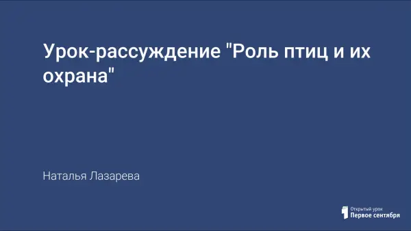 В разработке урока рассматривается значение птиц в природе и жизни человека, приводятся примеры. Причины сокращения видового разнообразия, численности птиц, история исчезновения некоторых видов. Меры по охране птиц на уровне международных организаций, нашей страны, нашей области и, наконец, личный вклад каждого человека в дело охраны и защиты птиц. Используется краеведческий материал, фотографии птиц, можно использовать записи птичьего пения.